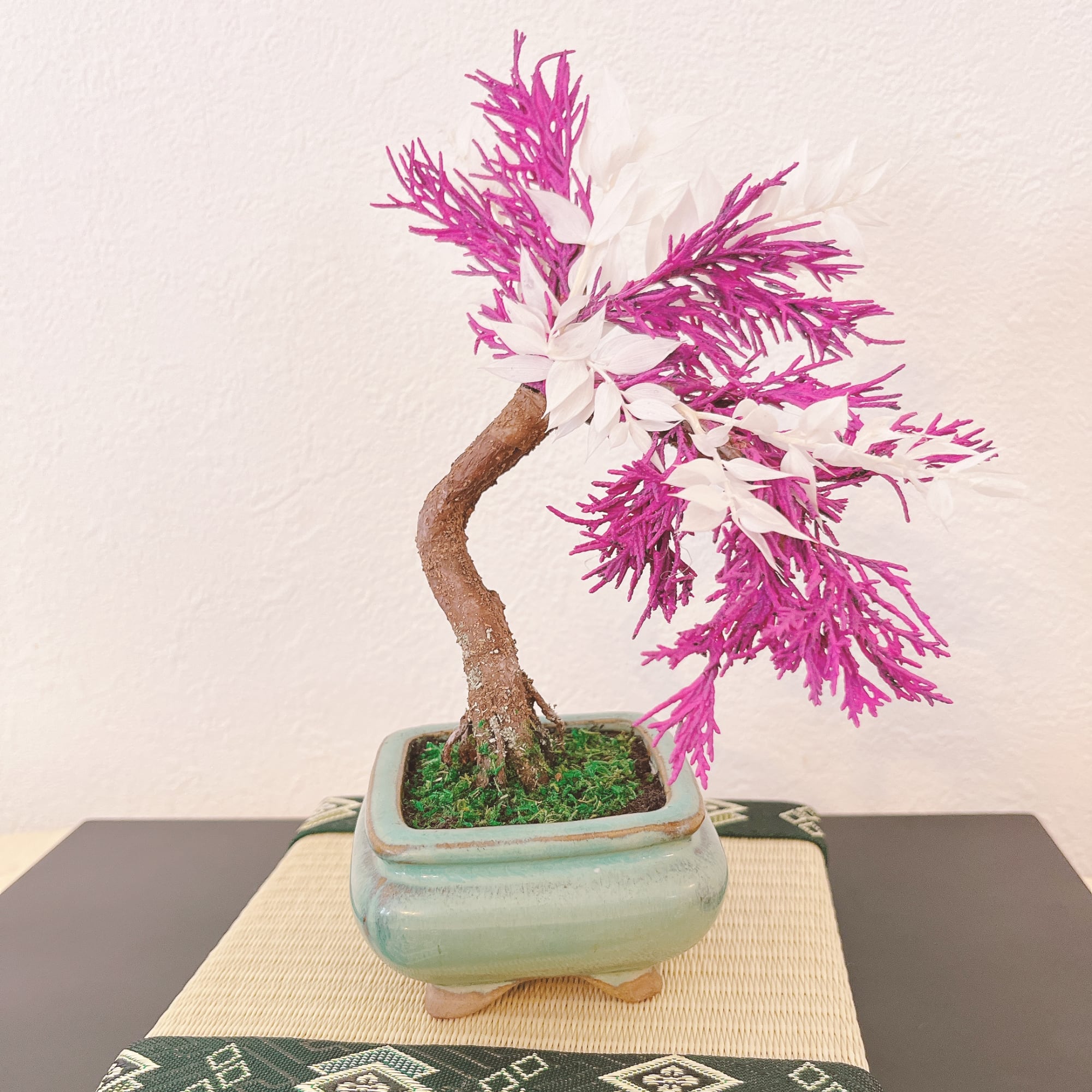 鮮やかなピンクと白のプリザーブドをあしらった、印象的なアート盆栽です。
